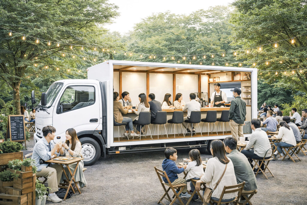 雨の日でも、暑い日でも、寒い日でも、営業する日を選ばない最高の全天候型イートインキッチンカーです🚚